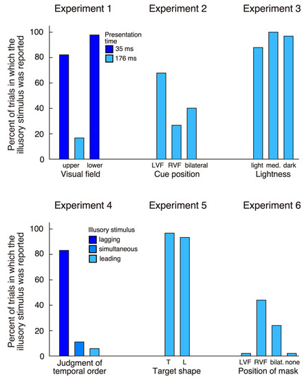 Summary of the findings of all six experiments. Vertical bars show the percentage of responses when HG reported the presence of a stimulus in the left visual field, as a function of the type of stimulus shown in his right visual field. Experiment 1: right target shown in the upper (35 ms and 176 ms) or lower visual field (35 ms); experiment 2: right target, with cue in the left/right visual field or bilateral cues; experiment 3: right target at three levels of lightness; experiment 4: right target; experiment 5: right target is a T or L; experiment 6: right target with left mask, right mask, bilateral mask or no mask (LVF/RVF: left/right visual field).