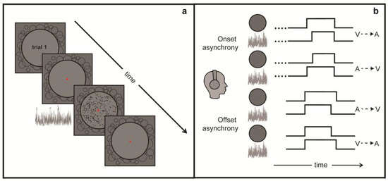 - van Eijk, R.L.; Kohlrausch, A.; Juola, J.F.; van de Par, S. Temporal interval discrimination thresholds depend on perceived synchrony for audio-visual stimulus pairs. J. Expt. Psychol. Hum. Percept. Perform. 2009, 35, 1254–1263. [Google Scholar] [CrossRef] [PubMed]