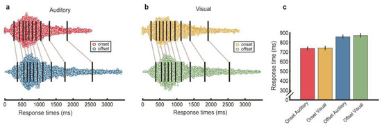 Plotted in Figure 3 are each of the harvested individual response times for onset and offset conditions contingent on the participants’ responses. This aggregation of response times uses a comprehensive graphical format known as a shift plot function [52]. With this mode of presentation, the spread of points within a given distribution is proportional to the density of response time values for onset and offset trials on which participants’ responses indicated that visual versus auditory was the leading event. For each of the four distributions, we divided the dot clouds into ten bins ordered in terms of response times, where each bin (i.e., decile) contained the same number of responses (within rounding error). The black lines within each dot cloud denote the median response times for each of the ten bins, and the blue lines connect pairs of median values for corresponding decile bins in the onset and offset data sets, for both auditory and visual response conditions. Evident in these shift plots are conspicuous, consistent rightward slants to the lines connecting the medians for equivalent deciles, implying that response times for offset trials tended to be slower than response times for onset trials. No such trend was seen when pairwise shift plots are arrayed to contrast visual versus auditory responses (not shown). Note, these plots are descriptive in purpose and are not intended to test different models of response time (cf. [53]).