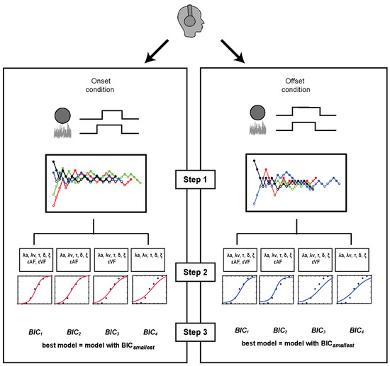 Model fitting approach. (Step 1) For each participant, pool and bin event judgments from valid staircases for the onset condition and for the offset condition; (Step 2) Deploy the “separate fit” method implemented by García-Pérez and Alcala-Quintana [24] to model the data separately for the onset and the offset conditions. In this step, 4 subsets of the full model were defined, a model with both response error parameters, models with one or the other of the two response error parameters, and a model with no response error parameters. All four subsets contained sensory, bias, and resolution parameters (see text for details); (Step 3) For each subset model, parameter values giving the best fit (maximum likelihood) were determined, and the goodness of each fit was expressed using the Bayesian information criterion (BIC) index, with the “winner” for each condition (onset or offset) being the model with the smallest BIC value.