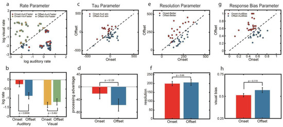 To analyze the estimates of the rate parameters, we log-transformed the values to reduce the skewness in the distribution of the data considering that the values ranged from 0.002 to 5. Figure 5a shows a scatterplot of log-transformed estimates of auditory (x-axis) and visual (y-axis) rate parameters for the onset and the offset tasks. For both tasks, a greater proportion of the participants had auditory rate estimates that were higher than their visual rate estimates indicating faster auditory processing. This observation was more remarkable for the onset task (32 out of 42) than the offset task (24 out of 42).