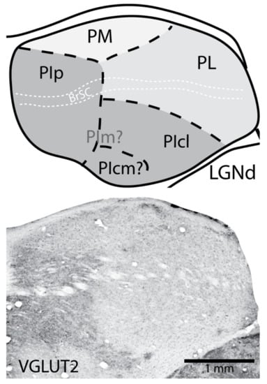 - Nakamura, H.; Hioki, H.; Furuta, T.; Kaneko, T. Different cortical projections from three subdivisions of the rat lateral posterior thalamic nucleus: A single-neuron tracing study with viral vectors. Eur. J. Neurosci. 2015, 41, 1294–1310. [Google Scholar] [CrossRef]