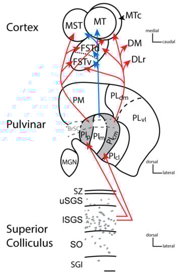 The superior colliculus sends both types of inputs to the pulvinar complex. In primates, two nuclei of the inferior pulvinar, PIp and PIcm, get driving inputs from neurons in the inner superficial gray of the superior colliculus. One of the characteristics of driving neurons in subcortical structures is that they use the vesicular glutamate transporter 2 in their terminals (e.g., []). The neurons in the superficial gray of the superior colliculus that project to PIp and PIcm express vesicular glutamate transporter 2 (VGLUT2) mRNA in their cell bodies and VGLUT2 protein in their synaptic boutons in PIp and PIcm [,,]. PIp and PIcm then project densely to the middle layers of several areas of the MT complex (including the middle temporal crescent, MTc, the dorsal fundus of the temporal sulcus, FSTd, the ventral fundus of the temporal sulcus FSTv, and the medial superior temporal, MST, areas) (Figure 3), but very little, if at all, to MT [,]. The nucleus that projects to MT, PIm, has few or no inputs from the superior colliculus and is activated instead by inputs from MT. Thus, PIm is more or less a satellite of MT, receiving inputs from MT and perhaps sending back a modulating input [], although PIm receives some direct inputs from the retina [,], and the neurons projecting to MT appear to be drivers by being glutamatergic and weakly parvalbumin positive []. In intact monkeys, MT is highly dependent on V1 for activation (e.g., [,]), and lesions of the superior colliculus have no notable effect on the response properties of neurons in MT [] nor on attention effects on MT neurons []. On the other hand, cortex within the floor of the superior temporal sulcus including FST is a part of the MT complex which does receive superior colliculus input via the pulvinar and is functionally dependent on the superior colliculus []. Similar results have been reported in mice, where a lateral visual cortical area, which receives input from the superior colliculus via the pulvinar, is also dependent on superior colliculus neuronal activity []. These findings support the idea that this driving pathway through the caudal pulvinar from the superior colliculus has been conserved across rodents and primates and hint at a possible homologous region of cortex in rodents that has become the MT complex in primates. MT and areas of the MT complex are areas of the dorsal stream of visual cortical processing that also include the dorsomedial visual area (DM) and the rostral half of the dorsolateral visual area (DLr) or rostral V4 (Figure 4; see [] for review).