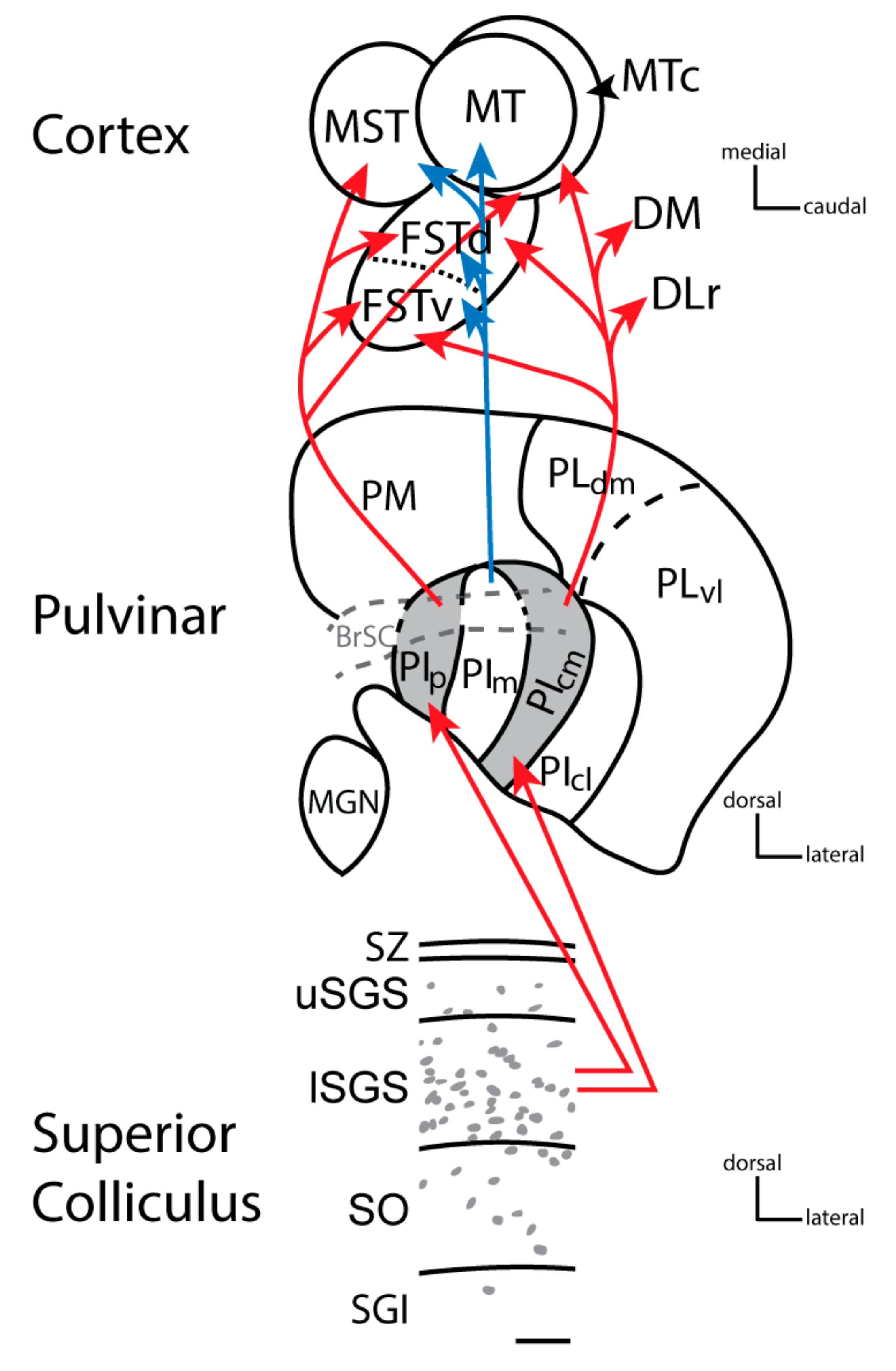 The progression of information from the superior colliculus to the pulvinar and cortex in New and Old World monkeys. Cells within the lower stratum griseum superficial (SGS) project to the posterior and central medial inferior pulvinar (see red arrows), which then project to the middle temporal complex divisions in temporal cortex, except MT itself, as well as other dorsal stream visual areas including the dorsal medial (DM) and the rostral division of the dorsal lateral (DLr) area. The cells within the superior colliculus that project to PIp and PIcm contain vesicular glutamate transporter 2 mRNA [,]. The terminals of these cells express VGLUT2 protein within the pulvinar resulting in PIp and PIcm staining darkly for VGLUT2 protein (grey: [,,], The superior colliculus does not project to the medial division of the inferior pulvinar (PIm: [,,], but PIm is this division that has strong connections with MT (see blue arrows). The image of the superior colliculus shows a coronal view of the dorsal layers of the superior colliculus: The stratum zonale (SZ), the upper stratum griseum superficiale (uSGS), the lower griseum superficiale (lSGS), the stratum opticum (SO), and the stratum griseum intermediate (SGI). Grey dots depict the general distribution of VGLUT2 mRNA within the superior colliculus in New World monkeys (Adapted from []. Conventions for the pulvinar are similar to Figure 1, except the dark gray shading depicts dark VGLUT2 protein staining. The cortex shows the organization of MT complex areas as they would appear in sections cut tangential to the pia surface in flattened cortex preparations (i.e., with the superior temporal sulcus opened). MT is the middle temporal area, the middle temporal crescent is MTc, FSTd and FSTv are the dorsal and ventral divisions of the fundus of the superior temporal sulcus respectively, and MST is the medial superior temporal cortex. Other divisions with connections to PIp and PIcm include the rostral division of the dorsal lateral area (DLr) and the dorsal medial area (DM). Connections with V1 [] but see [] and V2 [], especially with thick stripes [], have also been described for the medial aspect of the inferior pulvinar but are not indicated here.