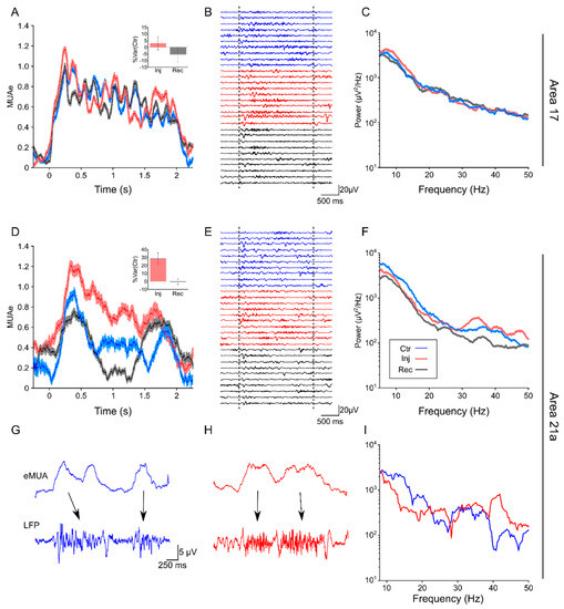 Oscillatory cortical responses during the inactivation of the LPl. Representative examples of simultaneous electrophysiological recordings in areas 17 and 21a, evoked by drifting gratings during control (Ctr, blue trace), injection (Inj, red trace) and recovery (Rec, black trace), conditions. (A) Average MUAe, (B) ten local field potentials (LFP) samples, and (C) average LFP power spectra are responses from an electrode placed in layer II/III of area 17 (Animal 2). The inset in A shows the %Var(Ctr) for Inj and Rec periods. (D) Average MUAe, (E) ten LFP samples, and (F) average LFP power spectra are responses from another electrode placed in layer IV of area 21a (Animal 2). The inset in A shows the %Var(Ctr) for Inj and Rec periods. (G) and (H) are cortical oscillatory responses that come from the same electrode shown in panels D, E, and F (layer IV, area 21a). Panels (G) and (H) show MUAe and LFP before and during the injection of GABA in the pulvinar, respectively. The arrows indicate the co-activation between the MUAe and the oscillatory activity in the LFPs. (I) LFP power spectrum evoked by the visual stimulation in Ctr and Inj conditions. Note that oscillatory response around the gamma band (40 Hz) is facilitated by the inactivation of the LPl (red line, panels (H) and (I). In panels (A), (C), (D) and (F), shadow areas represented the bootstrapping of random averages (1000 repetitions), to obtain a confidence interval at a threshold P = 0.05.