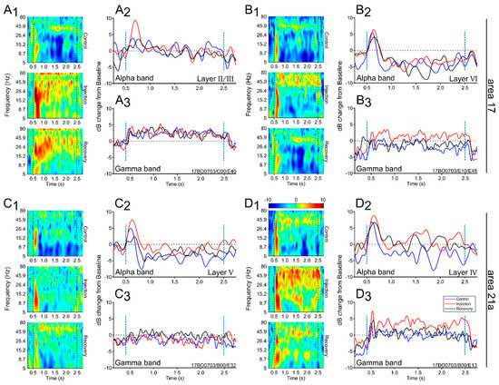 Oscillatory analysis for areas 17 and 21a recordings across experimental conditions. Wavelet analysis was used to calculate spectral estimates. (1) Time-frequency figures for representative samples. (2) Average time-frequency traces of alpha ranges. (3) Average time-frequency traces of gamma ranges for Ctr, Inj and Rec conditions. (A) Layer II/III recording from area 17. (B) Layer VI recording from area 17. (C) Layer V recording from area 21a. (D) Layer IV recording from area 21a.