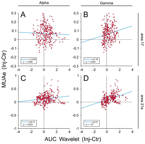 Influence of MUA activity on the oscillatory cortical responses of areas 17 and 21a. Area under the curve (AUC) of alpha- and gamma waves calculated by taking the amplitude of the wavelet analysis across the visual stimulation interval (Figure 2). The differences in the AUC between injection and control conditions for alpha- and gamma waves were correlated with the differences in the AUC for MUAs in the same periods. (A) Correlation for alpha band and MUA in area 17. (B) Correlation for gamma band and MUA in area 17. (C) Correlation for alpha band and MUA in area 21a. (D) Correlation for gamma band and MUA in area 21a.
