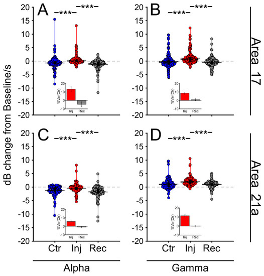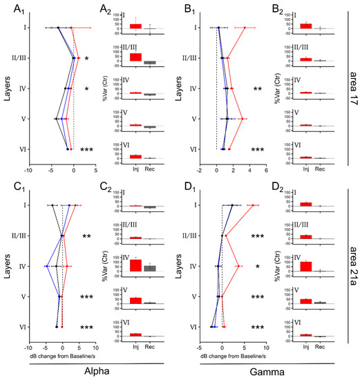 Although MUAes and oscillatory responses were correlated, several cortical signals drifted after the inactivation of the LPl. Such fluctuations were avoided by selecting oscillatory responses that had larger AUCs in injection than in recovery periods. This process ensured that the analyzed signal was stable over time as it returned to control values. The result of this analysis is shown in Figure 4 (Table S3). Here, the amplitude of alpha and gamma waves were significantly higher during the injection period than during the control and recovery periods. The LPl inactivation yielded mostly an increase in the amplitude of alpha and gamma bands of the LPF signals recorded in areas 17 (Figure 4A,B) and 21a (Figure 4C,D). However, the %Var(Ctr) showed that the oscillatory activity varied little during the injection period. On average, the activity varied by ~10% (Figure 4, insets). Since all cortical layers were selected, this analysis could be masking differences across cortical layers (Table S4). Moreover, the LPl inactivation on areas 17 and 21a effects varied considerably throughout the cortical depth (Table S1). Thus, in the next section, the layer dependency of the thalamic inactivation was investigated by comparing the changes in the amplitude of alpha and gamma oscillations across the cortical layers.