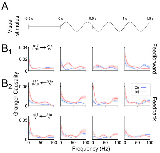 For the feedback coupling (panel B2), a different GC profile was depicted. Strong GC couplings at low-frequency bands were present before the presentation of the visual stimulation (−500–0 ms). In the next recording time window, when the visual stimulation was presented (0–500 ms), these low-frequency bands vanished. However, in the next visual stimulation window (500–1000 ms), the GC index for the inactivation condition increased again in the range of low-oscillatory waves. This profile of oscillatory activation was more evident for the feedback connections from area 21a reaching layers II/III than layer V of area 17. These findings suggest that during LPl inactivation, the GC coupling had a low gamma band enhancement from area 17 to area 21a (feedforward) evoked by the visual stimulation, and an alpha band increment from area 21a to area 17 (feedback) independent of the evoked visual responses.
