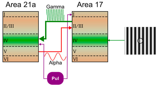Our current experimental results suggest that the LP is involved in the transmission of information by gating alpha and gamma waves throughout feedback and feedforward cortical pathways, respectively (Figure 7). Effective LP projections seem to have more driver influences toward area 21a, given the large amplification of gamma waves in layer IV during periods of GABA injection. Similar results were observed in the CRF of neurons in area 21a, in which the LPl inactivation generated an increase in the curve dynamic range [9]. Our results also show that feedback signals were more predominant at low oscillations in supragranular layers. Similar results have been found in the visual cortex of awake primates performing attentional-related tasks [12,39]. In that study, recordings in areas V1 and V4 indicated the occurrence of large alpha-wave feedback signals in superficial layers of V1, whereas gamma-band responses were elicited in layer IV, i.e., representing the feedforward pathway toward area V4. Theoretical works seem to validate our results, given that, in the simulations, the pulvinar facilitates the feedforward gamma transmission between two cortical areas [52,53]. Further works associating low and high oscillatory LFP signals may help to understand the nature of bottom-up and top-down pathways. Nonetheless, our findings suggest that the pulvinar should be considered as the gate of propagation of sensory information toward lower and higher cortical areas. Thus, one may hypothesize that the pulvinar is essential for an efficient feedforward and feedback information flow in the visual cortex.