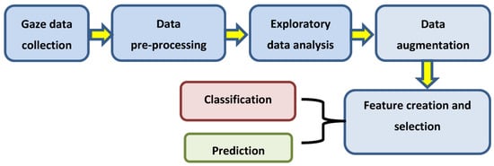 The concepts of this study were implemented in several phases. Eye tracking data was collected through special experiments using two consumer platforms, a desktop and a tablet, under different operating conditions. The collected data went through the processing pipeline (Figure 1) with an initial investigation using statistical methods and visualizations before being fed to the machine learning models. The data collection experiments, experimental setup, and steps of the data analysis workflow are described below. All subjects gave their informed consent for inclusion before they participated in the study. The study was conducted in accordance with the Declaration of Helsinki, and the protocol was approved by the Ethics Committee of SFI Project ID: 13/SPP/I2868.
