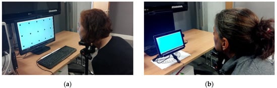 For eye tracking data collection, an eye tracker coupled with a visual stimulus interface (also called UI) was used. The trackers used were a Tobii EyeX 4C and an Eye tribe remote eye tracking device, which come with their own calibration routines. During an experiment session, participants were seated in front of the tracker with a chin rest and the UI ran simultaneously with the eye tracker. The UI shows a moving dot, which sequentially traces a grid of (5 × 3) known locations (also called the area of interest or AOI) over the desktop or tablet’s display. The dot radius is 10 pixels and it stops at each AOI for 3 s before moving to the next, and gaze data was collected while participants looked at the dot. Gaze data comprised of a participant’s gaze coordinates (x, y positions in pixels) on the (desktop/tablet) display and corresponding time stamps as estimated by the eye tracker. The known on-screen dot locations form the ground truth data and were used for accuracy calculations. The chin rest was used for stabilizing the participant’s head for all experiments (Figure 2g). A nine-point eye calibration was performed for all participants before each experiment session. Photos from the desktop and tablet experimental setup are shown in Figure 2a,b, respectively.