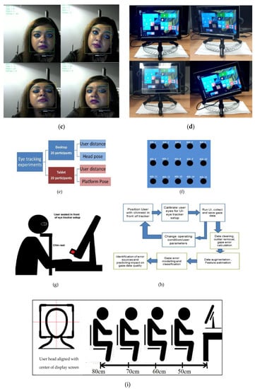 The maximum head and platform pose allowed by the eye tracker was 20 degrees and no tracker data could be obtained at distances below 50 cm or above 80 cm. Data from the user distance experiments were called UD50, UD60, UD70, and UD80 for distances of 50, 60, 70, and 80 cm, respectively. “HP” was used to denote head pose experiments. The process flow of experiments (Figure 2h) comprised of positioning the user in front of the desktop or tablet setup and calibrating their eyes with the tracker calibration software. Next, the UI was run with its data-logging routine to record gaze data in comma-separated values or CSV files, along with millisecond timestamps.