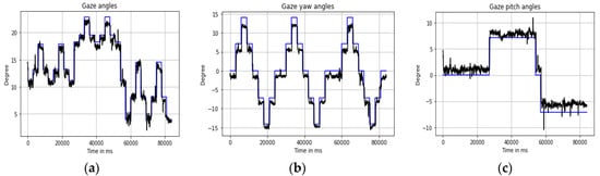 Time series of (a) gaze angles, (b) gaze yaw, and (c) gaze pitch angles (black lines with ground truth in blue lines) for one person during one experimental session for a neutral pose captured on the desktop setup.
