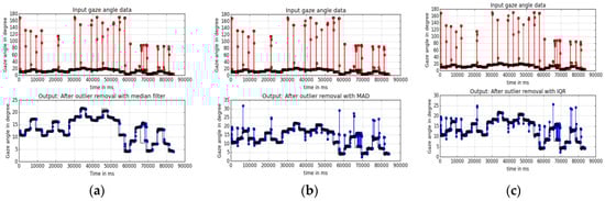 (ii) Median absolute deviation (MAD): This is calculated by taking the absolute difference between each point and the median, and then calculating the median of those differences. This is more robust than using the standard deviation for outlier detection as the standard deviation is itself affected by the presence of outliers [15]. (d) Inter-quartile range(IQR): The concepts of using the Z-score and inter-quartile range (IQR) to study outliers were discussed in our previous study [1]. A data point is denoted as an outlier if the value for the point is 1.5⋅IQR above the third quartile or below the first quartile of the data. The results from the three outlier removal methods are shown in Figure 5a–c and it is seen from the figures that median filtering (with a kernel size =41, which is the mean number of data points around each AOI) worked best for all of the datasets.