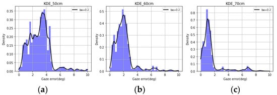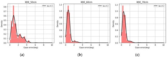 KDE plots over histograms of gaze error for user distances (a) 50 cm, (b) 60 cm, and (c) 70 cm for tablet data.