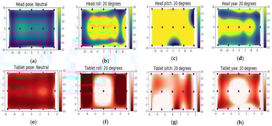 The two-dimensional spatial distribution of gaze error values over the display screen area, as a function of the corresponding visual angles for different datasets, were computed and are shown in Figure 8a–h. These plots show that factors like head pose angles have distinct impacts on the gaze error spatial patterns, with minimum errors obtained for neutral head positions. Similar features were seen from the tablet data plots, for different platform poses.