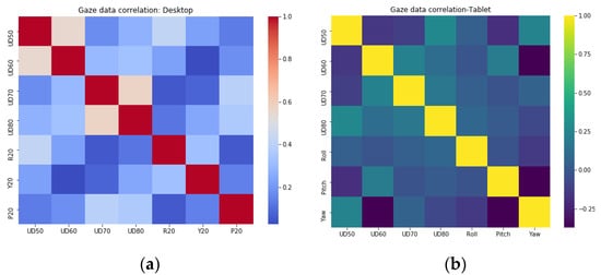 Desktop data from user distance experiments at 50, 60, 70, and 80 cm (UD 50, UD60, UD70, UD80) and head pose experiments at head roll, pitch, and yaw angles of 20 degrees, (R20, Y20, P20) were used to compute the desktop data correlation matrix of Figure 9a. Similarly, data from the tablet experiments for four user distances and three platform poses were used to compute the tablet data correlation matrix of Figure 9b. As can be observed, the gaze data collected under different operating conditions from the same platform and eye tracker do not have any correlations between their characteristics.