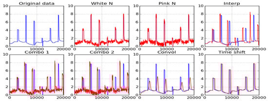 Shows a sample from a dataset after applying each augmentation strategy. The blue lines represent samples from the original data, while the red lines are from the augmented dataset after applying each strategy.