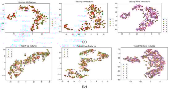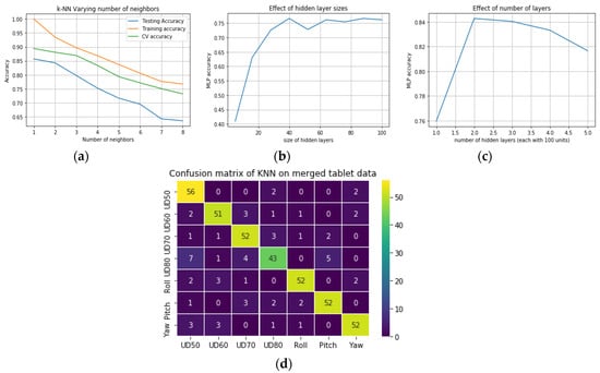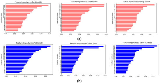 Before implementing the classification algorithms on both the desktop or tablet data, the user distance, head-pose, and tablet orientation datasets were augmented to increase the number of training samples [19,20]. After this, training features were constructed and formatted before being input into the models. Same data augmentation strategies were used for both the desktop and tablet data. For the training and testing, the gaze angle, yaw, and pitch feature datasets were created and used. The classification results from the desktop data are provided in Section 3.3 while that from the the tablet datasets are in Section 3.4.