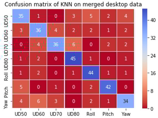 The following classification tasks were performed using the desktop datasets: (1) Classification of errors for different user distances (i.e., between four classes of data from a user distance of 50-, 60-, 70-, 80-cm datasets), (2) classification of errors for different head poses (i.e., between four classes: neutral pose, roll (20 degrees), pitch (20 degrees), and yaw (20 degrees) datasets), and (3) classification between the head pose and user distance errors patterns (i.e., between four user distance classes, and three head pose classes, with a total of seven classes). With data from the tablet experiments, the following classification tasks were implemented: (1) Classification of errors for different user distances (i.e., between four classes of user distances data), (2) error classification for different tablet orientation poses (i.e., between four classes of data from the neutral tablet pose, roll (20 degrees), pitch (20 degrees), and yaw (20 degrees) datasets), and (3) classification between the tablet orientation and user distance error patterns (i.e., between four user distance classes, and three tablet pose classes, with a total of seven classes).