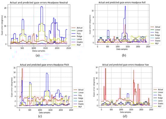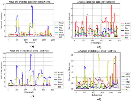Actual gaze errors (red) and predicted gaze errors for the tablet pose neutral, roll, pitch, and yaw (a–d) datasets.