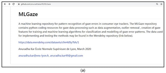 For any eye tracker other than the Eyetribe, the gaze error characteristics will be different based on the tracking principle and tracker hardware. Therefore, for other eye trackers, the classifier models described in this study have to be re-trained using data from the respective eye trackers if their characteristics vary widely from Eyetribe (which can be determined by comparing the respective eye tracker’s data with the data provided in the Mendeley data repository). To facilitate this and make it possible for researchers to replicate the principles of this study on their own eye tracker’s data, the codes for implementing the full data processing pipeline as described in this paper and in Figure 1 are provided in an open repository called MLGaze, hosted on GitHub ((Figure 17a). The link to the repository may be found here: https://github.com/anuradhakar49/MLGaze.