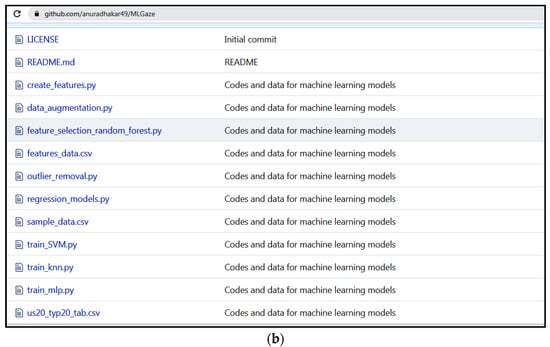 (a). The MLGaze repository hosted on GitHub, which contains Python coding resources for implementation of the methods described above. (b). Contents of the MLGaze repository.