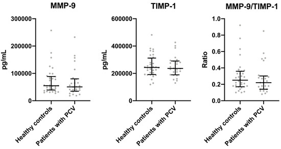 Patients with PCV and healthy control did not differ in plasma MMP-9 (p = 0.4), TIMP-1 (p = 0.9), or MMP-9/TIMP-1 ratio (p = 0.4) (Figure 1).