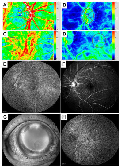 Five months after the baseline visit (the last visit), the IOP in the affected eye was 18 mmHg and the BCVA in the affected eye was 0.6 without any ophthalmic treatment. Laboratory blood tests showed reductions in the HbA1c (7.3%) and the cholesterol (181mmg/dl) levels. LSFG findings demonstrated sufficient blood flow and higher BOS in each vascular bed compared with that at the last visit (Table 1, Figure 3G,H). During the follow-up periods, the patients did not receive the retinal photocoagulation and revascularization surgery.