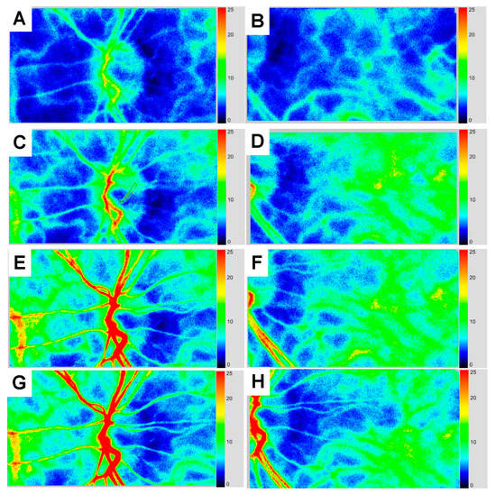 - Iwase, T.; Ra, E.; Yamamoto, K.; Kaneko, H.; Ito, Y.; Terasaki, H. Differences of Retinal Blood Flow Between Arteries and Veins Determined by Laser Speckle Flowgraphy in Healthy Subjects. Medicine 2015, 94, e1256. [Google Scholar] [CrossRef] [PubMed]