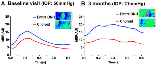 Changes in the pulse waveform in the entire optic nerve head and the choroid at baseline and 3 months after treatment. Pulse waveform in the entire optic nerve head (ONH) and the choroid at baseline. Intraocular pressure (IOP) was 50mmHg (A). Pulse waveform in the entire ONH and the choroid 3 months after treatment. IOP was 21mmHg (B). Blue color indicates the entire ONH, and red color indicates the choroid.
