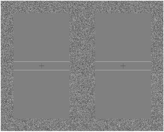 Stimuli were presented with a central black fixation cross with a luminance of 0.09 cd/m2. This was 37.9 long by 37.9 arcmin wide. To indicate when a response was required, a black 56.9 by 56.9 arcmin box of the same luminance appeared around the fixation cross. The fixation cross and box had line widths of 0.95 arcmin. Throughout each trial, an aperture frame of approximately uniformly distributed luminance noise, with individual pixels randomly assigned grey levels, was displayed around all stimuli. The aperture frame was 1.58 degrees wide, and had a minimum luminance of 0.09 cd/m2 and a maximum luminance of 59.9 cd/m2. The half-screen visible through the stereoscope used was 10.1 degrees wide and 16.2 degrees tall. Within the aperture frame, a rectangle 6.96 degrees wide and 13.0 degrees tall was used for stimulus presentation.