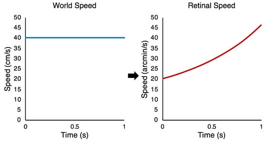 Speed–time diagrams of how an object moving towards an observer at 40 cm/s in the world, from a starting distance of 117 cm from the eye (left), translates into an accelerating retinal speed for the expansion of the object’s retinal image (right).