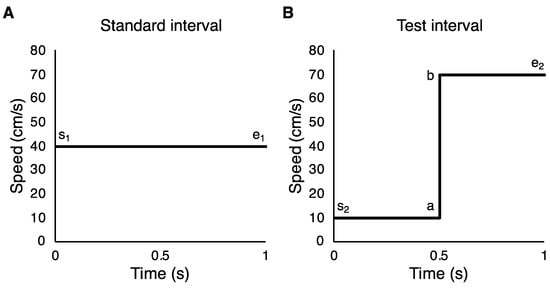 Speed-time graphs of (A) a standard interval and (B) a test interval in the Speed change condition. Participants could have used several different strategies to complete the speed change discrimination task—they could have compared points a and b, s1 and s2, or e1 or e2.
