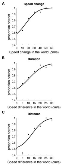 Example psychometric functions are shown for the Speed change condition (analysis I; Figure 4A), Duration condition (Figure 4B), and Distance condition (Figure 4C). We did not plot psychometric functions for the Speed change type II analysis in Figure 4. These psychometric functions use the same data as those for analysis I, but use the same x-axes as the Distance and Duration conditions.