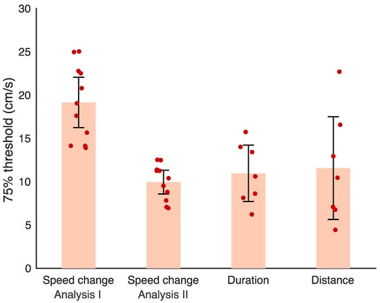 The 75% thresholds for the Speed change discrimination condition using both methods of analysis (n = 11), and the Duration and Distance speed discrimination conditions, both n = 7. Error bars are 95% confidence intervals. Individual data points for each condition are shown in red. Speed change analysis I was conducted in terms of the speed change within the test interval. Speed change analysis II was conducted in terms of the difference between the end speed of the test and standard intervals.