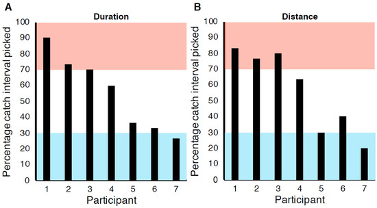 The percentage of occasions the catch interval was picked over the standard interval in the catch trials for (A) the Duration speed discrimination condition and (B) the Distance speed discrimination condition. Participants whose data lie in the pink region used distance cues. Within the blue region, participants used duration information. Data in the white region suggest participants used speed.