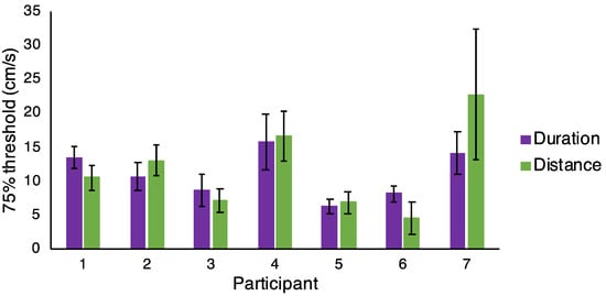 Individual 75% thresholds for each participant in the two speed discrimination conditions (Duration and Distance, n = 7). Error bars are standard error from the psychometric fit.