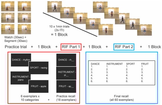 The translational cognitive benefits of physical expertise in video gaming, sports, music, and dance, have been studied extensively [20]. Long-term physical training, especially in dance, have been shown to refine knowledge schemas through neuroplastic changes to visuomotor and cognitive processing areas [21,22,23,24,25,26,27,28]. These effects are suggested to enhance processing of, and access to, declarative and procedural information to achieve peak performance in sport as well as in laboratory tests of cognitive function [29]. Recent investigations have revealed that both observational and physical learning facilitate action verb processing [30], with prior knowledge exerting top-down cognitive influences on event segmentation behaviors and verbal memory in the same experiment [31]. We conducted a similar dual-paradigm experiment to assess Aim 2 (transfer of sensorimotor expertise to improved verbal WM performance) with the RIF task. Subjects were presented with several category–exemplar word pairs (e.g., FRUIT—apple, RELATIVE—cousin) before recalling a subset of exemplars and categories (e.g., FRUIT—ap__). This results in three types of items: practiced words from practiced categories (Rp+), non-practiced words from practiced categories (Rp−), and non-practiced words from non-practiced categories (Nrp). Subsequent recall revealed two reliable effects—a practice effect (i.e., Rp+ items recalled best) and RIF (i.e., Nrp items recalled better than Rp− items) [32,33]. It is suggested that the retrieval practice of Rp+ items creates competition for limited cognitive resources and suppresses retention of Rp− items at final recall [34,35,36]. By including dance, instrument, and sport category words, Aim 2 of the present study was to explore whether expert participants in dance, music, and athletics would have improved recall of experientially-relevant words, respectively (Hypothesis 3; H3). By priming embodied knowledge schemas with observed dance stimuli, the current study would reveal putative genre- and domain-specific transference of sensorimotor expertise to improved attentional and verbal WM performance.
