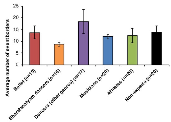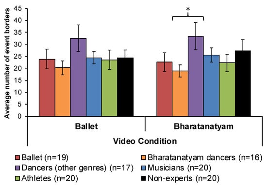 While these investigations compared event segmentation in non-experts and/or experts highly familiar with the genre of the experimental stimulus, it remains to be observed whether these effects are generalizable to (1) expert dancers in other genres of dance and/or (2) experts in other physical domains, including musicians and athletes. Transfer of visuomotor pattern recognition across genres or domains has been demonstrated in expert team ball sport athletes (i.e., netball, basketball, and field hockey) [19]. Therefore, Aim 1 of the present study will explore genre-specific and cross-domain event segmentation behaviors. Experts in dance, music, and sports, as well as non-experts, segmented two dance videos (ballet and Bharatanatyam) as well as a non-dance control sequence. We hypothesized that dancers familiar with the observed genre (i.e., ballet dancers segmenting a ballet video) would indicate fewer event borders than dancers from unfamiliar genres (e.g., contemporary or jazz) (Hypothesis 1; H1). We also predicted that all sensorimotor experts (dancers, athletes, and musicians) would demonstrate fewer event borders for all video conditions compared to non-experts (Hypothesis 2; H2), demonstrating generalized expertise effects during event segmentation of dance and non-dance movements.