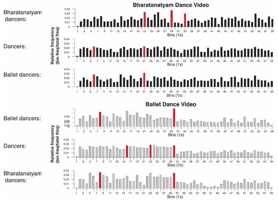 Event borders for ballet and Bharatanatyam videos among familiar and unfamiliar dancers. The most-commonly-identified event borders are marked in red. Familiar Bharatanatyam dancers identified bins 29 and 33 more frequently than other groups, while other dancers segmented bin 6. All dancers segmented the ballet video most frequently at bin 30, and unfamiliar dancers segmented bins 16 and 23.