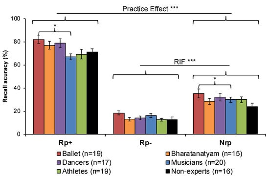 To test our second hypothesis that experts would demonstrate improved recall for experientially-relevant words, practice recall was assessed with a two (category—“Dance”, “Instrument”) × six (groups) repeated measures ANOVA, and final recall was assessed with a three (category—“Dance”, “Instrument”, “Sport”) × six (groups) repeated measures ANOVA. Statistical analyses for the RIF data were conducted in SPSS (Version 22, IBM Corp., Aramonk, USA). All pairwise comparisons were adjusted with a Bonferroni correction. Effect sizes are reported with partial eta squared and Bayes factor (BF) as a measure of the likelihood in support of the null (BF01) alternate (BF10) hypotheses using the ‘BayesFactor’ package in R (Version 0.9.12-4.2). Significance criteria for main and interaction effects was set at p < 0.05, and pairwise comparisons at pBonf < 0.05.