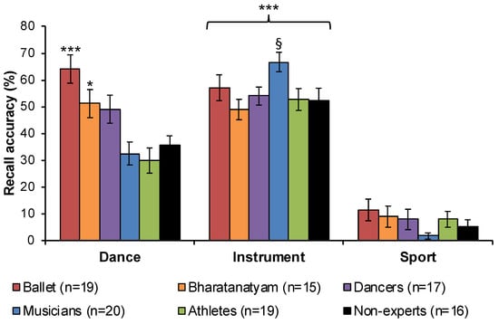 Final recall of experientially-primed words. Ballet and Bharatanatyam dancers showed preferential recall of experientially-primed dance words relative to non-dance experts as well as non-experts. All groups recalled instrument words more than dance and sport words. Error bars show SEM. §p < 0.05 uncorrected * p < 0.05 *** p < 0.001.