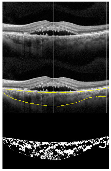 Algorithms have been developed to measure choroidal vascularity of en face OCT scan by extraction and binarization. Vupparaboina, et al. demonstrated an automated vascularity estimation technique. The technique uses scans separated by 5 µm segments of choroid based on a validated algorithm in which RPE-Bruch’s complex and choroid scleral interface were identified using structural similarity index, Hessian analysis and tensor voting [65]. An adaptive histogram equalization method is then employed to enhance contrast between choroidal stroma and blood vessel lumen. In addition, binarized images are reviewed by independent observers blinded to each other to make sure the images are correctly converted by comparison with the original en face scans [66] (Figure 4 and Figure 5).