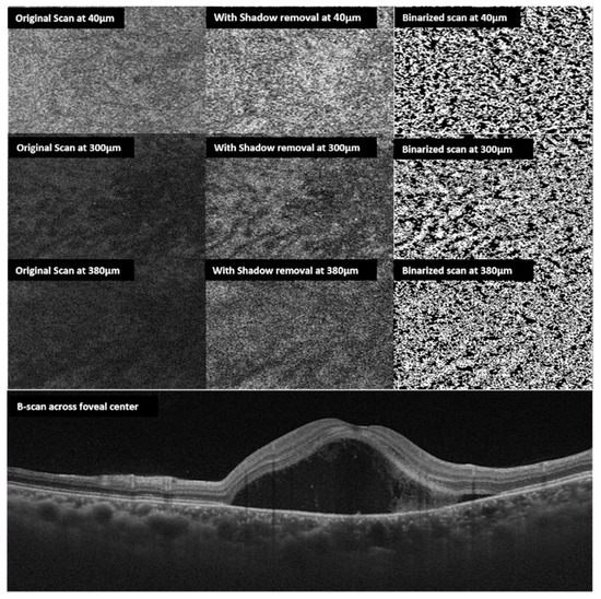 En face choroidal vascularity: multiple en face scans obtained at 40, 300, 380 µm from the Bruch’s membrane top to bottom respectively (left side). The middle column shows en-face scans following shadow removal. The right column shows corresponding binarized scans. The bottom horizontal B scan shows the neurosensory detachment of the same eye with CSCR.