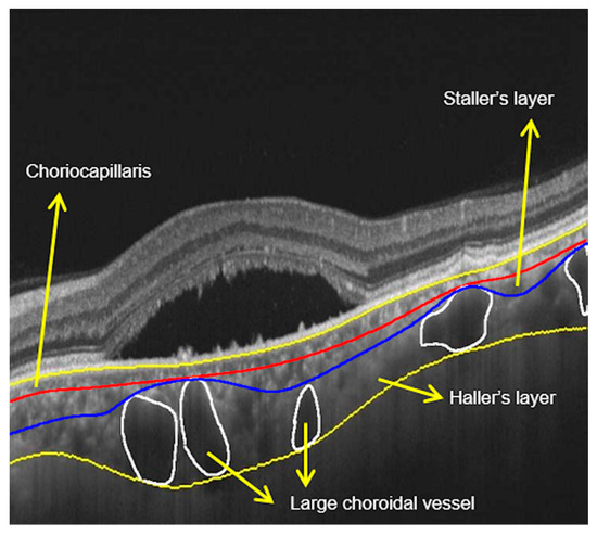 Automated quantification of choriocapillaris, Haller’s layer, and Sattler’s layer thickness is an important biomarker for the pathogenesis of CSCR. In a study comparing the thickness of the choriocapillaris, Sattler’s layer, and Haller’s layer with EDI-OCT, the authors found statistically significant thicker Haller’s layer in diseased eyes versus fellow eye (disease patients) and eyes of healthy individuals; there were no differences in choriocapillaris/Sattler layer between study groups [83]. This finding suggests that Haller’s layer is the main contributor to choroidal thickening in CSCR. Haller’s layer thickness may be a more sensitive biomarker for disease activity than total choroidal thickness. However, the measurements were performed manually and were associated with relatively low interobserver reliability of 0.795 [12]. An automated quantification of Haller’s layer is important for further investigations on choroidal layer changes in CSCR (Figure 7). A study using an algorithm validated both quantitatively and qualitatively was able to delineate the different layers of the choroid [83]. Unlike retinal layers, choroidal layers are not separated by sharp intensity transitions, making delineation a challenge. Because of this challenge, traditional gradient based techniques cannot be employed. A study employed algorithm using extended-minimal transform alongside watershed segmentation to address this challenge. The algorithm was able to achieve delineation results with a dice coefficient of 89.48% and a high intra-observer dice coefficient of 89.12%. The absolute difference for automated vs. manual evaluation was 17.54% and 19.9%, respectively. The higher correlation between the algorithmic and manual delineation indicates the possibility of clinically analyzing choroid in finer detail, especially in disease state [83]. Haller vessel analysis explores the pachychroid mechanism in CSCR and may help understand progression of the disease process with inner choroidal thinning and chronic complications.