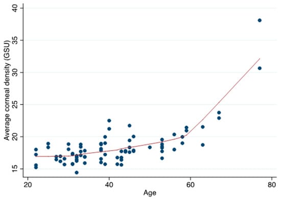 Scatter plot showing the relationship between age and average corneal densitometry (GSU).