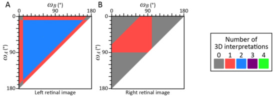The left and right panels of Figure 4B show the number of possible interpretations of the left and right retinal images in Watanabe’s [31] Condition 3. The individual images cannot be projected from about 20% of the triangular shapes. The number of possible interpretations was often 1 or 2 and it was rarely 4. The number 3 was not observed. This ambiguity remained even when the test was done binocularly. Many triangular shapes can be projected to both of the retinal images.
