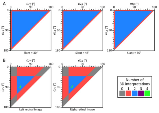 The results of these analyses are shown in Figure 4. Each point in these maps represents the shape of the triangle ABC. The abscissas and the ordinates show two angles ωA and ωB of the triangle ABC. The third angle ωC could be computed as ωC = 180°—ωA—ωB. Colors of the point indicate the number of possible interpretations of a triangle with a specified shape (ωA, ωB, ωC).